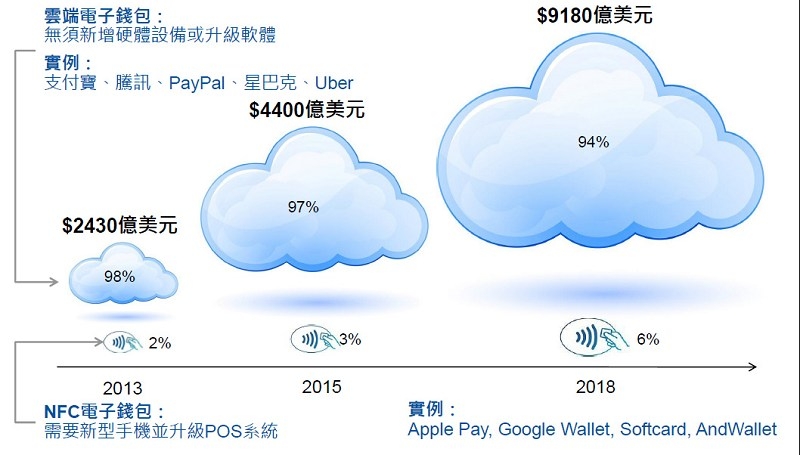 日新月異的行動技術讓智慧手機的功能越來越強大,受惠於行動技術的成熟,也讓行動支付商機越來越大,在蘋果、三星、Google等其他廠商的努力下,更讓行動支付在全球快速發展。根據Gartner預測,行動支付市場將會從2013年的2,430億美元成長至2015年的4,400億美元,而2018年預計將達到9,180億美元。