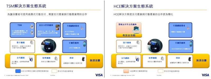 其生態系統較為複雜,牽涉到了手機供應商、行動網路業者、安全元件供應商及TSM等業者。VISA總經理麻少華指出,在此平台中,每個業者都扮演相當重要的角色,因此需要支付產業與行動產業間的合作。