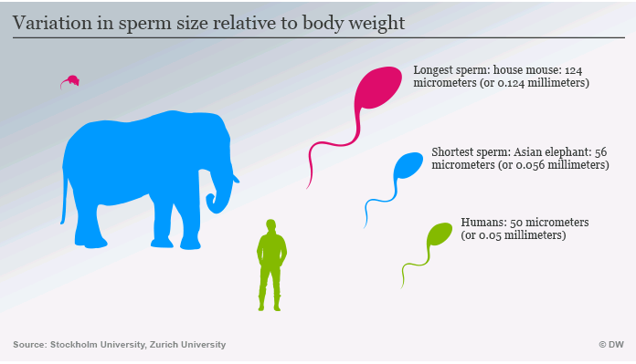 (家鼠的精子是哺乳動物裡面最長者,達0.124mm;亞洲象精子長度則只有0.056 mm;人類精子長度比大象略小為0.05 mm。資料來源:Stockholm and Zurich Universities。圖片:DW)
