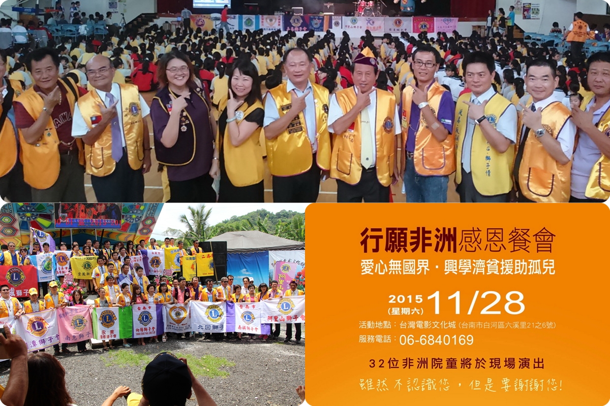愛要及時更要無國界,熱衷社服公益活動的300d1區國際獅子會,年度最大飢餓救助盛事,就是即將在11月28日中午,台南白河的台影文化城內,舉辦的「行願非洲感恩餐會」活動,這場盛會是獅子會嘉義18分會共同主辦,雲林和台南為協辦,預計募款目標是101萬元,捐贈給台灣慧禮法師所發起的阿彌陀佛關懷中心,故活動當天,早上十點遊影城,11點入席,同時該中心ACC全球總執行長也是重量級藝人孫翠鳳,在台影除了代表向大家致謝,慧德法師代表受贈外,更有非洲助養兒表演哦。愛心認購專線:06-6840169。