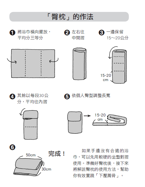 臀枕是「下壓薦骨」的一大重點。最厚的部位以8cm為宜,一定要做出適合自己的臀枕。生活中常見的用品,包含浴巾、椅墊、枕頭、書籍雜誌都可以是幫助減輕腰痛的小助手,臀枕的製作及正確使用方法,本書皆有詳細圖解及說明。