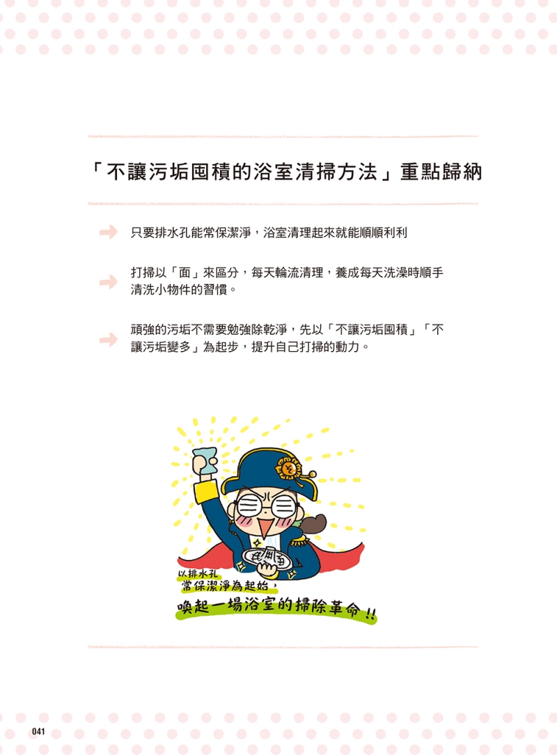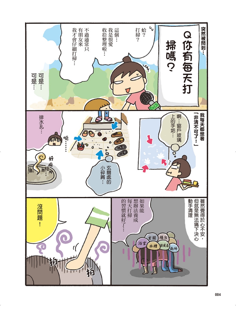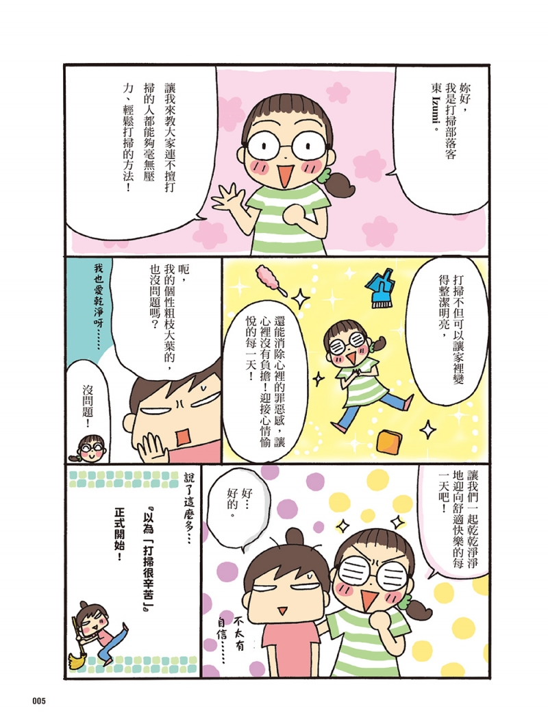 本書透過插畫家Mameko小姐生動的漫畫,在開頭就先幫助大家培養「想動手打掃」、「來打掃一下也不錯」的前進動力。