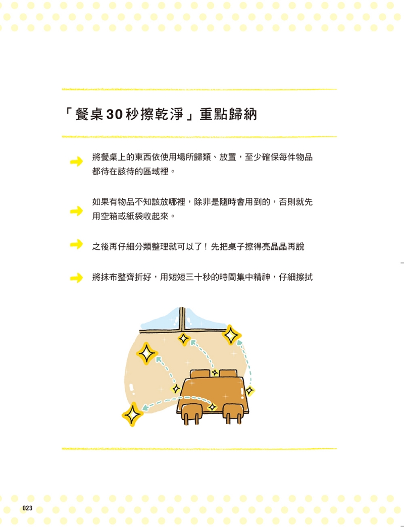 第一章首先介紹的是「簡易打掃」的方法,平日只要花個5秒鐘就能讓家裡看起來整潔乾淨。