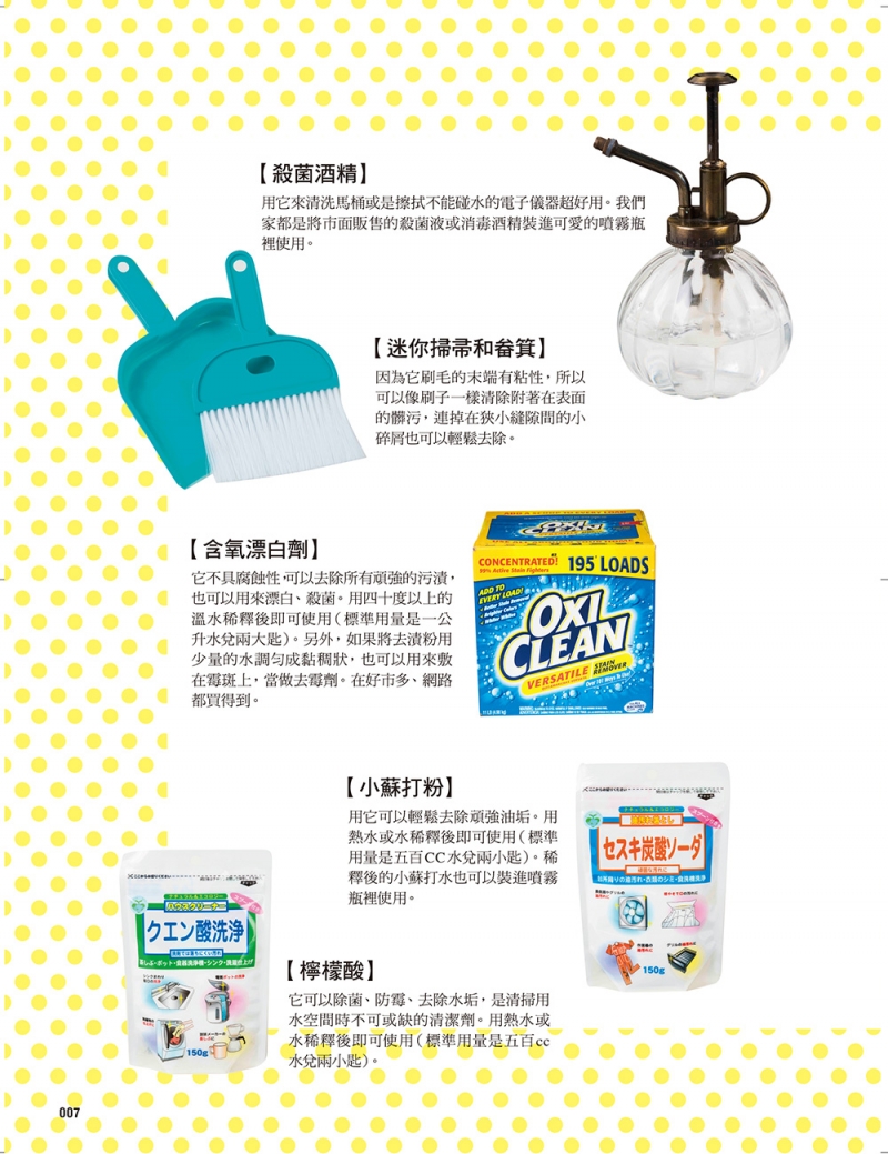 第二章則是介紹日常家務中大約花個3分鐘即可順手清理的「中等打掃」方法,這些方法主要多針對容易藏污納垢的用水空間。