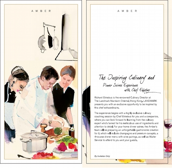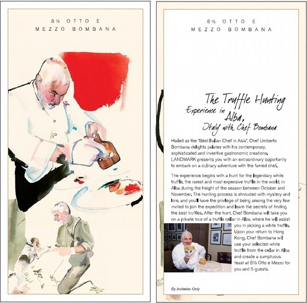 先來說說香港置地廣場,是聚集頂級的高級訂製、米其林餐廳美饌、奢華服務的百貨公司,與眾多百貨不同的事情是主打許多令人不可思議的客制化服務,所以插畫的主題方向變的更多元,美食部分就有AMBER、BOMBANA等國際名廚的行程,帶您去採最新一季節的松露,以及到您家替VVIP們做菜。