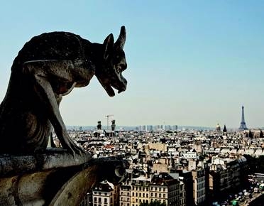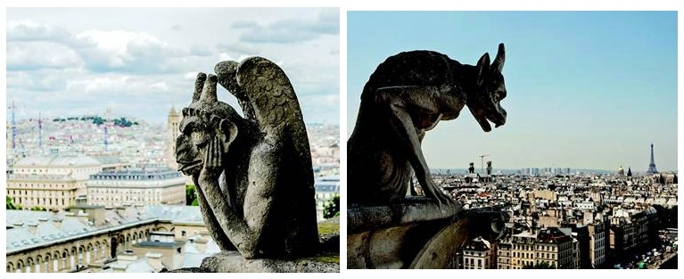 Cite)的聖母院,節骨嶙峋的建築體警醒地看守著城市。教堂外的下層牆面有賢者雕像,上層牆面有一些石像,遠觀像是一個人蜷伏在牆上,爬上鐘塔才發現原來是吐水獸,有些還是人面獸身的造型。這些攀附在屋簷的吐水獸睜大雙眼,蓄勢待發撲向敵人。這驚悚的畫面使人回想起《新約.彼得前書》5:8 所載:「務要謹守、警醒,因為你們的仇敵魔鬼,如同吼叫的獅子,遍地遊行,尋找可吞吃的人。」