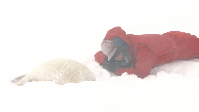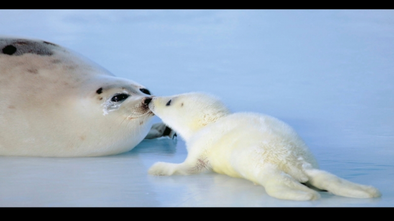 我們現在已經到了浮冰上,看到豎琴海豹了。寒風刺骨、暴雪狂襲,在這個全身凍僵,連呼吸都要凝結的冰凍世界,人類絕無可能生存,飛禽鳥獸也近乎絕跡,但豎琴海豹卻從北極圈游三千公里,爬上這一大片浮冰,迎接新生命的降臨。