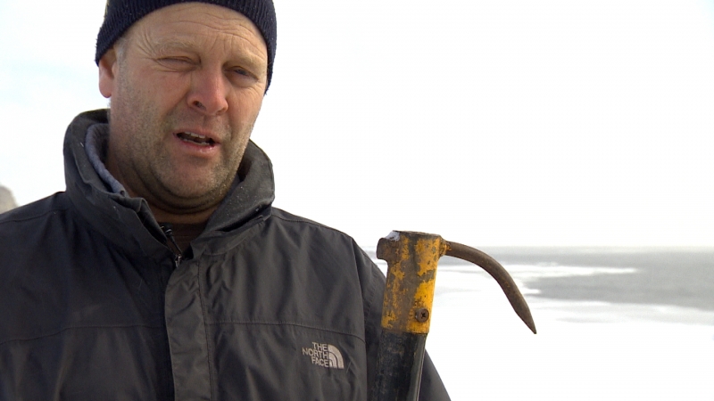 Gilbent是島上居民,他的父親也是海豹獵人,這個一邊像鎚子,一邊有尖鉤的Hakapik刺棒,就是每年冬天他們維持溫飽的工具。「打一棒比子彈還要快速,因為你可以很確定打死牠了,如果用子彈,你可能打不準。」