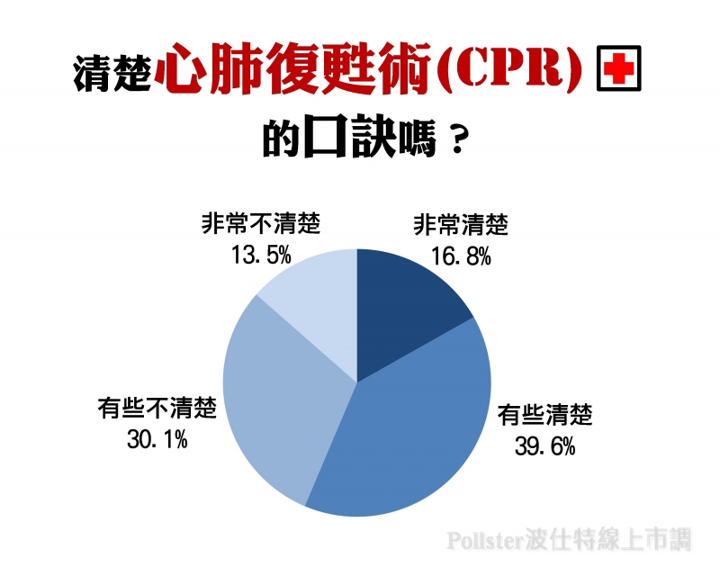 根據Pollster波仕特線上市調網針對「請問您清楚『心肺復甦術(CPR)』的口訣嗎?」所進行的調查結果,約五成五受訪者表示清楚「心肺復甦術」的口訣,其中「有些清楚」者占多數,約為整體受訪者之39.6%,而「非常清楚」者則約占16.8%。而由此結果可得知,僅約半數民眾清楚「心肺復甦術」口訣,顯示部分民眾仍欠缺急救技能相關知識,亦可見政府於全民急救教育的普及與推廣上尚有進步空間。