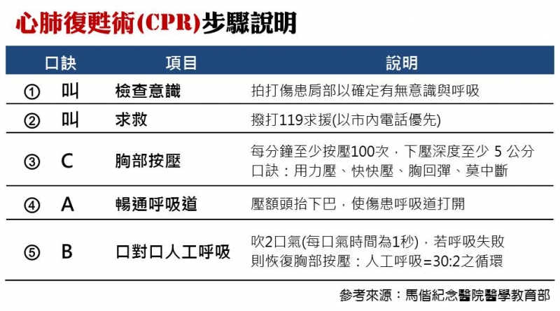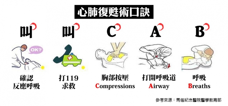 俗話說「天有不測風雲,人有旦夕禍福」,生活突發意外非人所能預料,不論是車禍、溺水或心肌梗塞,事件的發生隨時都可能導致「生死一線間」。一旦人體心跳及呼吸驟然停止而未及時急救,只要超過4-6分鐘便足以導致腦細胞壞死。而若能於等待醫護人員抵達期間,把握患者的生存黃金時間、延續其呼吸與血液循環功能,便有機會挽回無可彌補的傷害。因此,「心肺復甦術(Cardiopulmonary Resuscitation,簡稱CPR)」的技能知識與運用便顯得更為重要。不過至今有多少臺灣民眾清楚「心肺復甦術」的口訣呢?