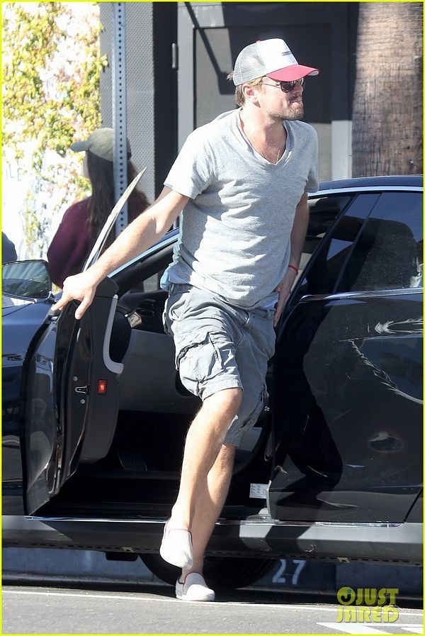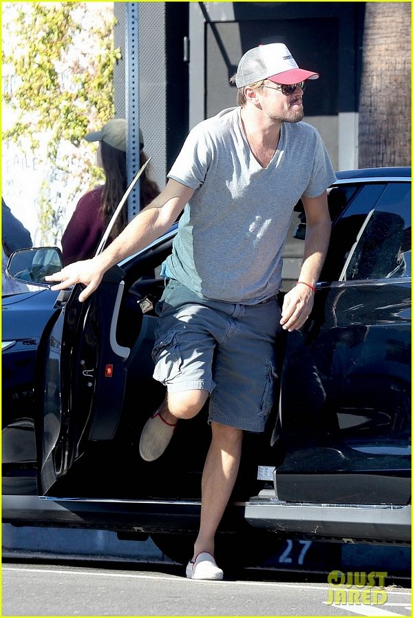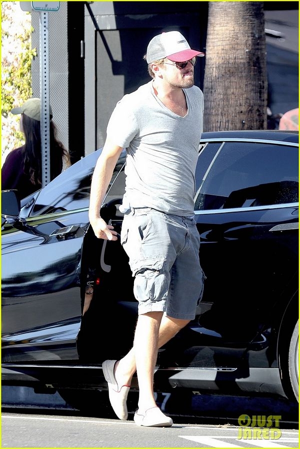 仔細看看李奧納多的褲子,正確來說是褲子上很大一條"裂縫"。李奧納多先是跟凱莉開車到餐廳前,不曉得是因為下車動作太大還是出門太倉促,李奧納多竟然穿著一條已經破了快1/3長的短褲下車。