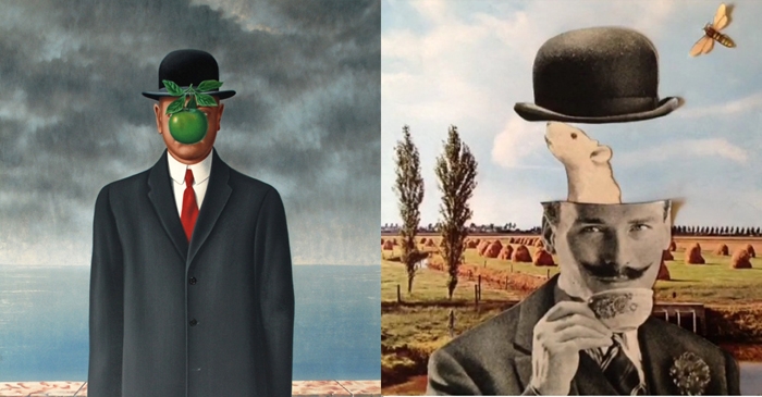 一位男人站在自然田園前,優雅地拿著咖啡杯,但他頭上的黑色小禮帽,不斷往上彈開,出現手錶、土撥鼠、女人、小鳥、蜻蜓、汽車等廣告圖案。這是比利時藝術家史拉賓克(Sammy Slabbinck)向超現實主義畫家馬格利特(René Magritte)致敬,用廣告拼貼與數位動畫創作的短片《一切都在腦海中》(It's all in the mind)。