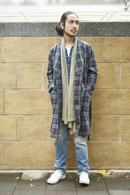 輕鬆的襯衫與長版外套的搭配,在中層部分用了絲巾讓視覺效果更為集中,然而下身的淺刷色牛仔褲與白布鞋讓也減輕了上身的沉重感。