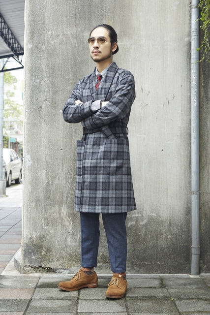 運用大格紋與小格紋的搭配巧思,讓整體視覺看到了有別於以往的細膩技巧穿搭,而在足部的紅襪部分要人不注意到也難。