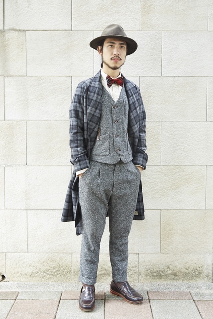 週末就該正式的的盛裝打扮,背心、領結與白襯衫,在上身的環節完全顧慮之下,下身的毛料西裝褲更是與背心互相呼應。