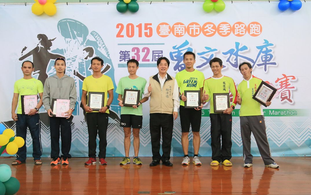 由南市府與中華民國田徑協會共同主辦的「2015臺南市冬季路跑-第32屆曾文水庫馬拉松賽」,13日上午假曾文水庫園區熱鬧開跑,來自全國的路跑同好齊聚一堂,場面盛大。市長賴清德一早也前往現場,為選手加油打氣,並親自頒發獎狀予12公里男女各組的優勝者,市長表示,曾文水庫馬拉松是本市全民運動的壓軸,感謝大家年年的熱情參與,而這項賽事也會一直陪伴大家,歡迎全國朋友繼續來挑戰這項全國歷史最悠久的馬拉松路跑活動。