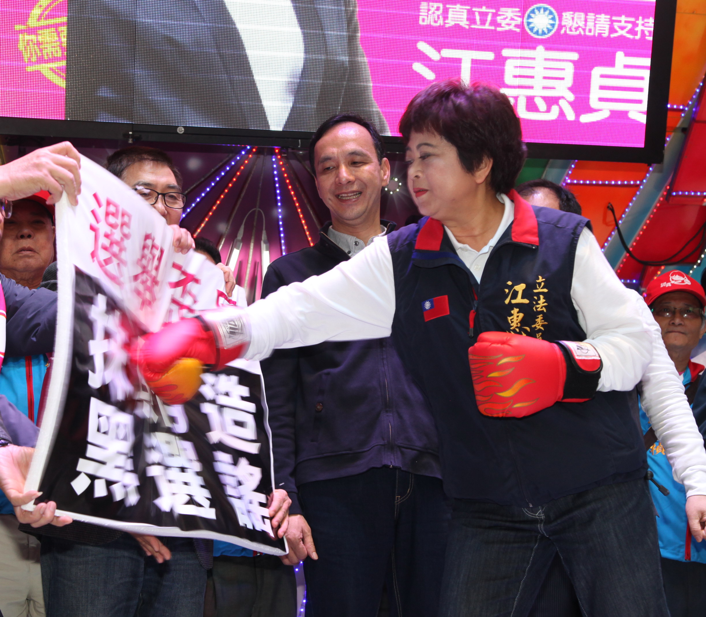 隨著選戰進入倒數與選情膠著,地方負面的流言甚囂塵上,對手也不斷祭出負面文宣攻擊,一向秉持乾淨、正面選舉的江惠貞,特別在朱立倫與群眾的見證下,戴起拳擊手套,將「抹黑、賄選、造謠」三大選舉的歪風圖板一舉擊破,並強調選舉再如何的激烈,都不該出「奧步」抹黑對手、造謠生事;前立委李勝峰指出,雖然國民黨近年執政的表現不盡理想,但江惠貞問政、服務名列前矛的表現是事實,不能否定她的努力,也不能把執政不利的帳算在她頭上。