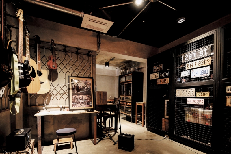 同樣是搜羅得來的台灣早期鐵花窗,改造成樂器掛架鎖於牆面上,與幾把吉他相互襯映,別具衝突趣味。