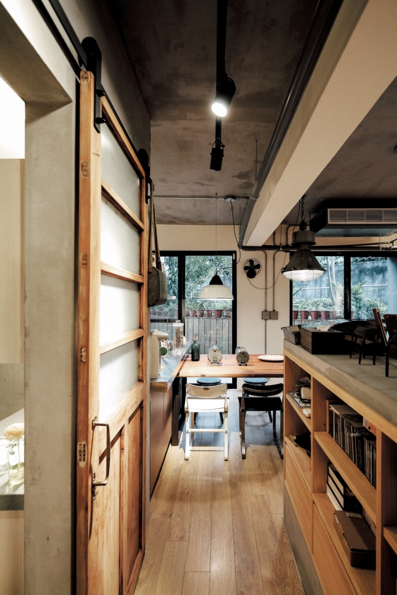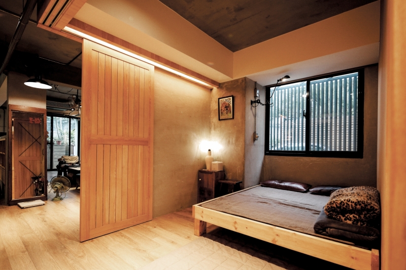 唯一較為美中不足的,是屋宅空間並不算寬敞,室內實際坪數僅27坪,扣掉公共空間、衛浴與書房佔地後,若要再以實牆隔出主臥與小孩房兩間房,其實很難不顯得壓迫,因此設計師Victor運用木頭拉門設計,作為主臥活動式的隔牆,白天把拉門完全推開,視覺上便能完全通透,也讓通往地下室的走道不致過於狹隘陰暗,到了晚上就寢時,將木門拉起,便是一方私密空間。值得一提的還有地下室,現在看來是具有鮮明搖滾個性的練團室,其實前屋主原本是用來堆放雜物的儲藏室,空間既陰暗又潮濕,還好Victor靈機一動,在書房與地下室之間開了一道細窄型的天井,不僅引入了少許的自然光線,也成功地解決空氣不流通的潮濕問題,相當聰明。