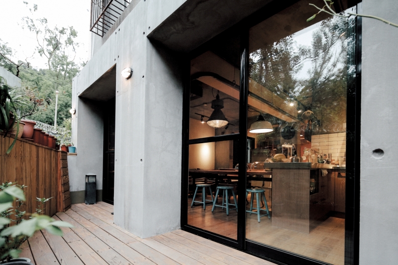 由於牆面開出兩片落地窗,設計師特別在屋外做了補強結構,並運用仿清水模工法,讓山中小路上的登山客望過來,也能感受到工業風格氣息。