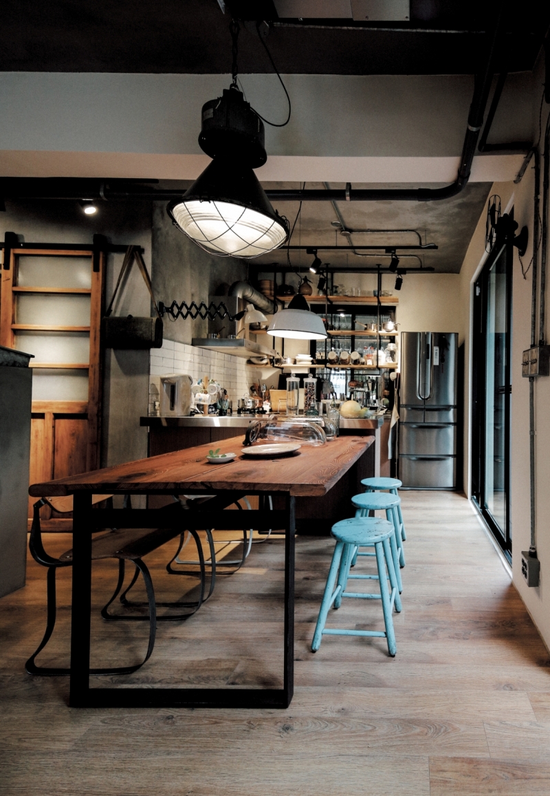 後方廚房以水泥粉光牆面、不鏽鋼檯面廚具搭配手工白色瓷磚與上吊式鐵件結構木櫃,打造出剛硬冷冽卻又不失溫潤感的工業風格;前方餐桌運用台灣早期老木門改造而成,一邊放上三張無靠背的粉藍色舊木凳,另一邊則是美國早期縫紉椅。