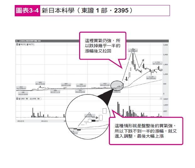 另外,也有可能是跌掉超過漲幅的一半,然後快速回升。這裡的拉回幅度,不一定是一半,一半只是一個參考值。總之,在股價跌到漲幅一半左右時買進,以鎖定反彈上漲的差價。此時反彈上漲的幅度,大約是跌幅的一半左右。