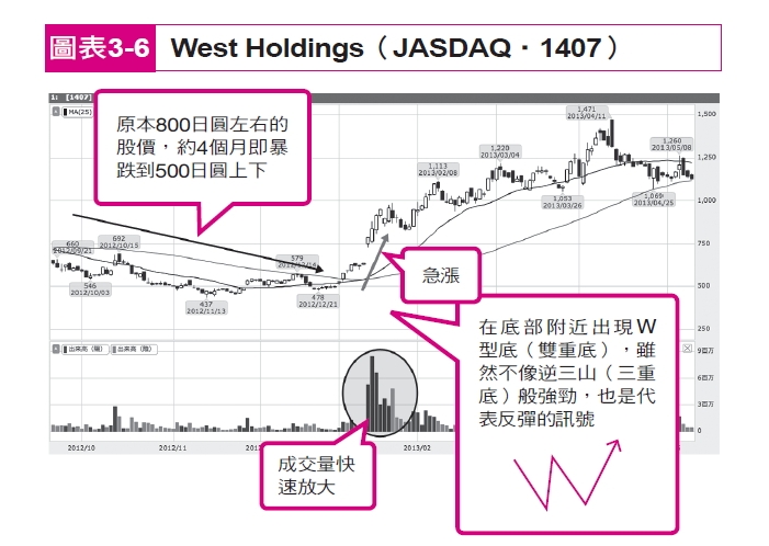 由 W 型底(雙重底)急漲後,就進入大漲行情。要仔細觀察,掌握上漲的起始點。