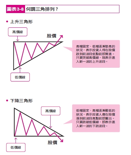 當股價突破此三角形的上線時,就是創新高,也是買進的訊號(見下頁圖表 3-8 上圖)。