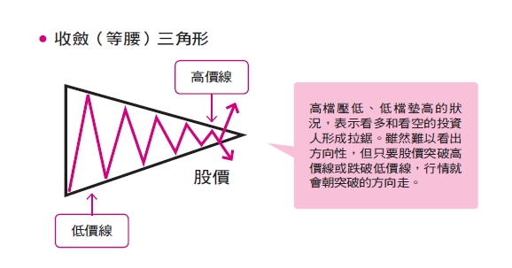 三角排列是在上漲趨勢中,頭部水準可能不變、或是慢慢變低,底部水準則是緩步墊高。最高價與最高價連成的直線,和最低價與最低價連成的直線,兩條直線向外延伸相交,形成一個三角形。