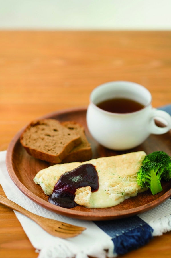 7 用少許的橄欖油熱鍋,接著慢慢把6倒入平底鍋中,以小火慢煎至蛋皮成型;接著,再把5放在蛋皮上,待其煎熟後,捲成歐姆蛋的形狀即完成。