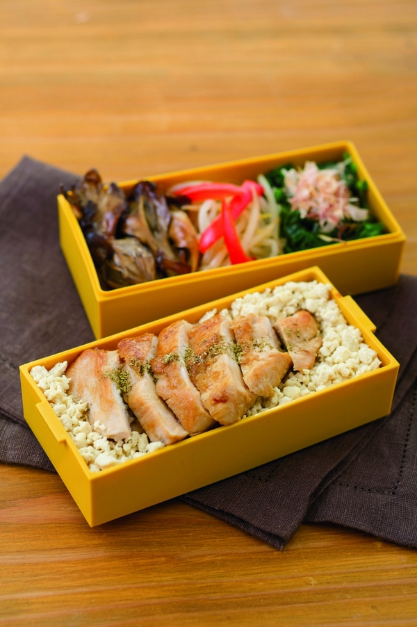 6 把1放進便當盒裡,再把5擺上,再撒些山椒粉提味即完成。