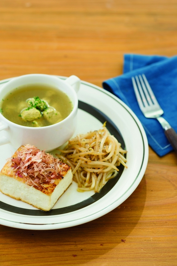 5 將煎好的豆腐和豆芽菜盛盤,在豆腐上撒些柴魚片、豆芽菜上撒些胡椒提味,即可享用。