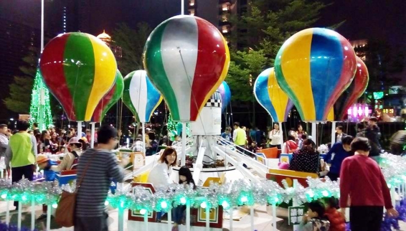 廣場前全部共有五種遊樂設施,分別是咖啡杯、熱氣球、小火車、旋轉小船以及旋轉木馬,很適合大小朋友們來遊玩,每天開放時間是晚上七點到九點,八點半就停止排隊了,所以想玩的人,早點來排就對囉!一切都是免費的呢!