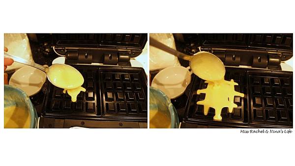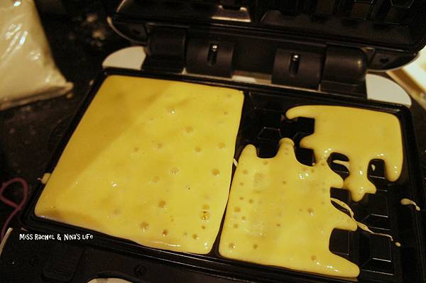 這時候先把機器預熱,用雙手靠近有點溫度就可以將鬆餅糊倒進去啦~~