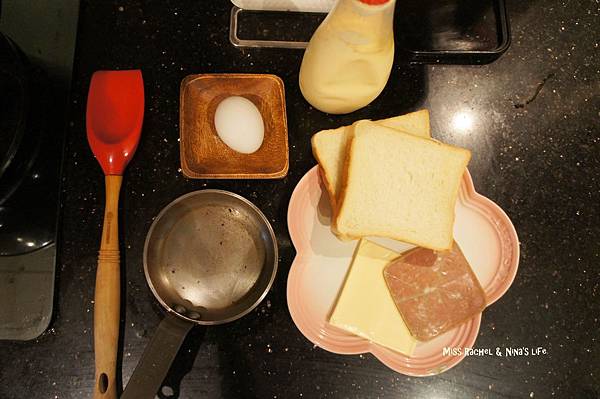 準備的材料也超簡單:火腿一片、雞蛋一顆、起司一片、吐司兩片,少許美奶滋。