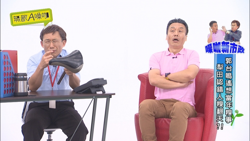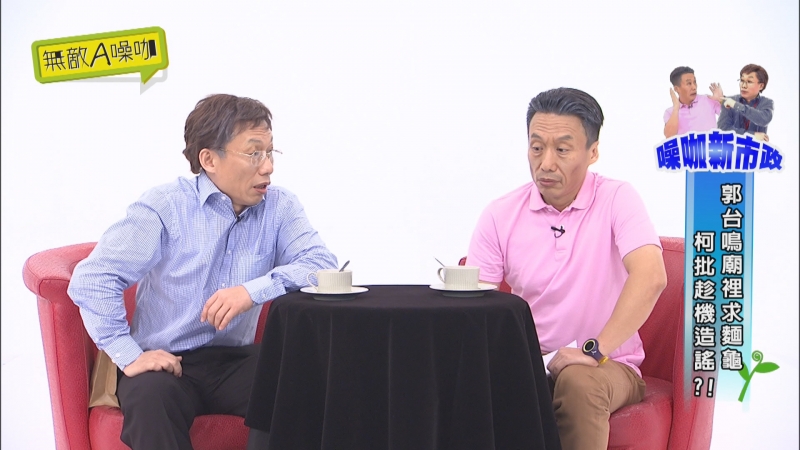 《無敵A噪咖》郭子乾一人分式兩角「柯批」、「郭台鳴」的爆笑短劇演出,這星期兩人相約喝咖啡,大方的郭台鳴得知柯批最喜歡騎腳踏車,特別說要送一台腳踏車給柯批,還建議要開一場記者會要兩人和解一下,柯批也關心郭台鳴最近有沒有名嘴在罵他,郭台鳴卻說:「太多人要登報跟我道歉了,所以我買了一家報紙,廣告費我要自己賺。」 問到敏感的大巨蛋問題,柯批問郭台鳴願不願意承接,郭台鳴妙回:「週刊上都有寫,宗信金要承接,當兄蒂象的主場阿,而且要300億,太貴了拉!」柯批聽到猛求郭台鳴說:「拜託你幫幫我拉,不然101一起給你如何!我再把翠玉白菜搬到101,這樣以後觀光客就更多了。」郭董卻猛點頭感覺可以考慮。