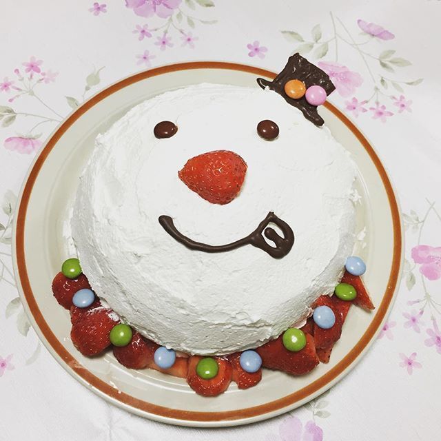 大的蛋糕完成之後,想像著小孩喜歡的雪人,利用鮮奶油和巧克力裝飾吧♪