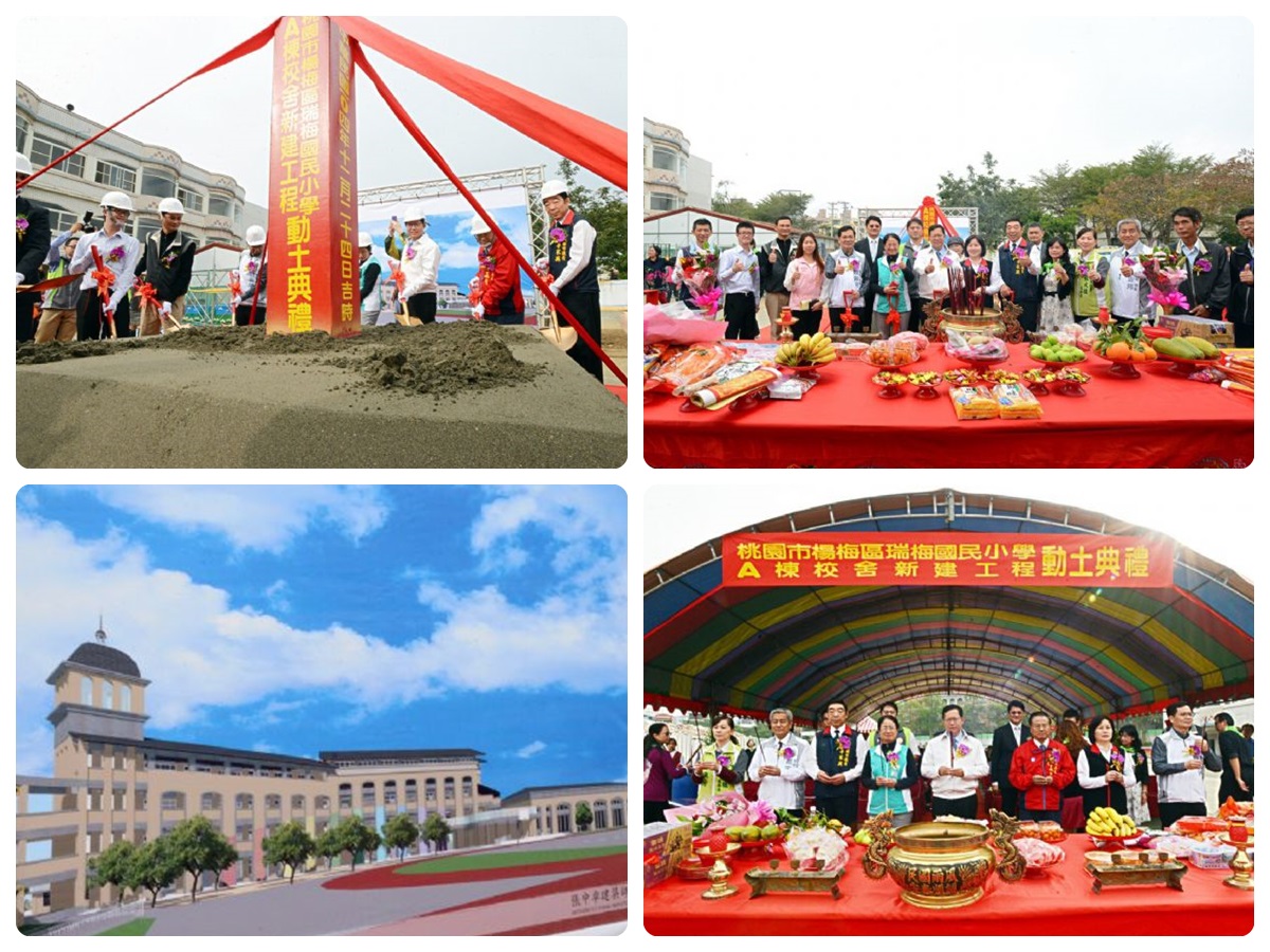 桃園市長鄭文燦24日出席楊梅區瑞梅國小「A棟教學大樓新建工程」動土典禮時表示,瑞梅國小將分別進行A棟教學大樓、活動中心的新建工程,經費各為1億1,000萬元及1億7,000萬元。今日動工的是A棟教學大樓的新建工程,同時也包括校園排水改善計畫,預計在106年9月開學前完工。