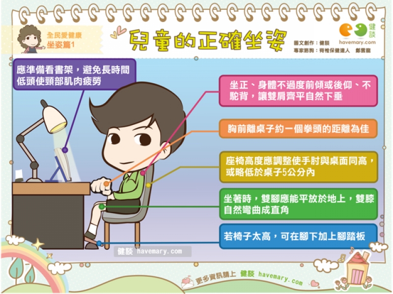 從學齡童開始學習唸書、寫字時,家長就應特別留意正確的姿勢:
