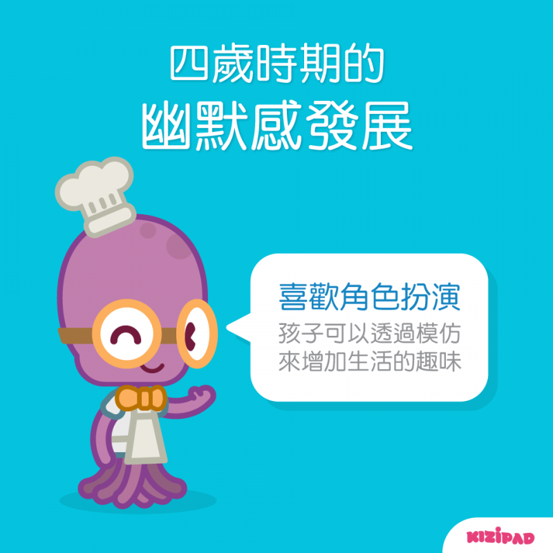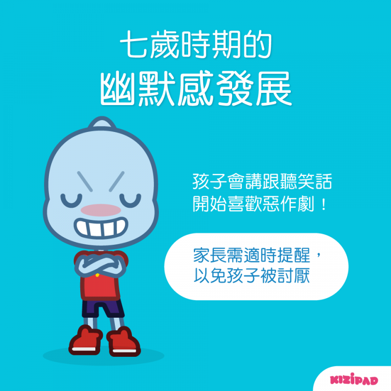 這個時期的孩子已經可以開始講笑話、聽笑話,也許內容不夠高雅,但他們會開始以笑話或惡作劇來平衡和調諧自己的心態。比方說: 這個時期的孩子會開始對不同性別的人開玩笑,像是:「你是女生但為什麼你剪的頭髮像男生?」。提醒家長這時期除了包容之外,也要讓孩子知道如果常常惡作劇或是嘲笑別人,雖然好像很有趣,但久了之後會很難交到朋友喔!