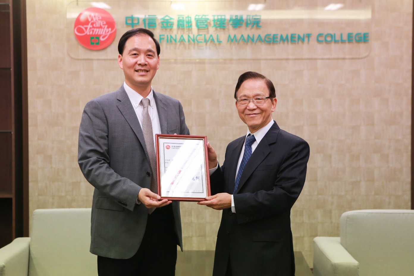 圖說:中信金融管理學院施光訓校長(左)致贈台大政治學系名譽教授蔡政文(右)感謝狀。(記者鄭永德 攝)