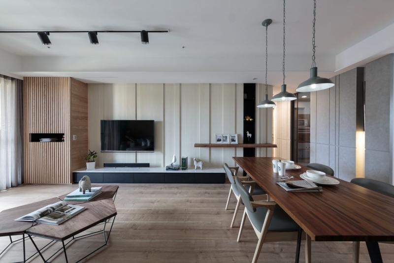 以白灰色系為主的視覺裡,在搭配木作收納櫃、實木椅以及木質地板後,替空間增溫不少。
