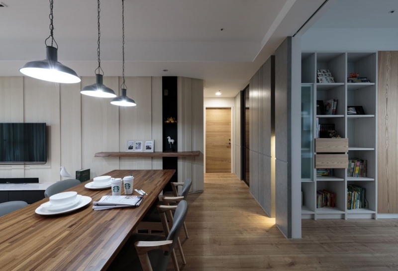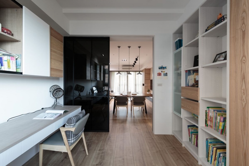 從書房到公領域,李千惠設計師運用一整片天然木紋鋪陳地板,讓視覺上有延伸之感。