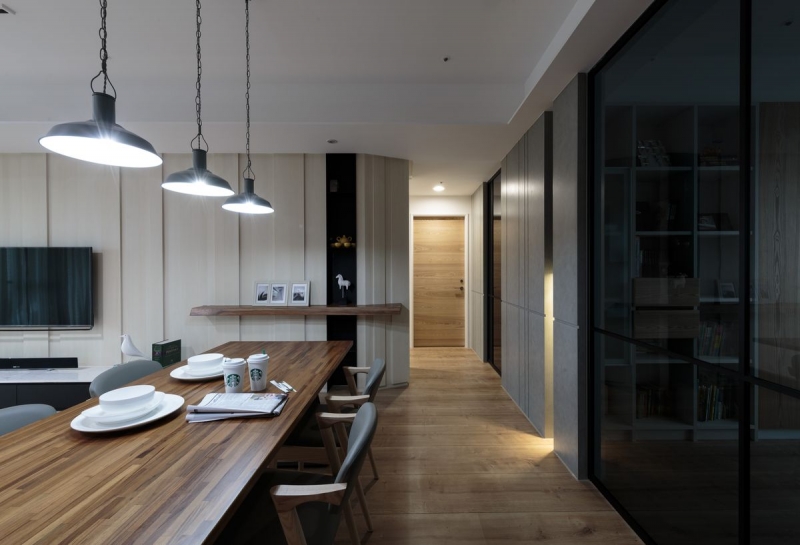 客、餐廳採開放的空間格局,營造寬敞感受,而餐廳跟書桌之間則運用黑玻璃鐵件拉門區隔公私領域,營造視覺穿透效果;以斜角方式處理電視牆右側的展示端角處,將冷硬方正的轉角印象,轉以柔和之美;而電視牆左側的木格柵櫃裡,同時兼具鞋櫃與電器櫃功能。大量木紋材質的鋪陳、延伸,挹注溫潤的感受;而系統櫃裝置滿足對收納機能有所需求的屋主,結合木作設計的搭配,讓視覺多了份靈活巧思。