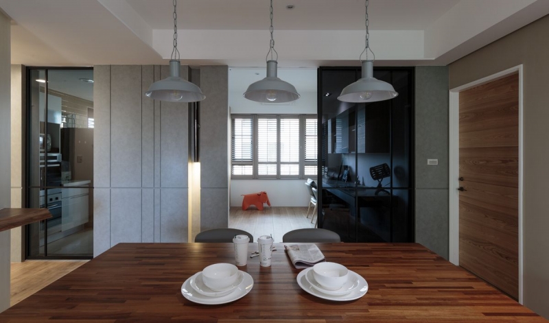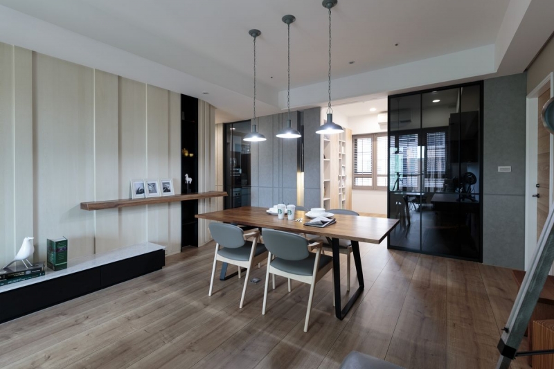 黑色玻璃結合鐵件的整片拉門設計,自然區隔餐桌與書房的公私領域。