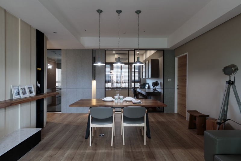 實木桌與木質感的地板舖陳,傳遞自然之美,運用深色鐵件設計框出獨有風格。