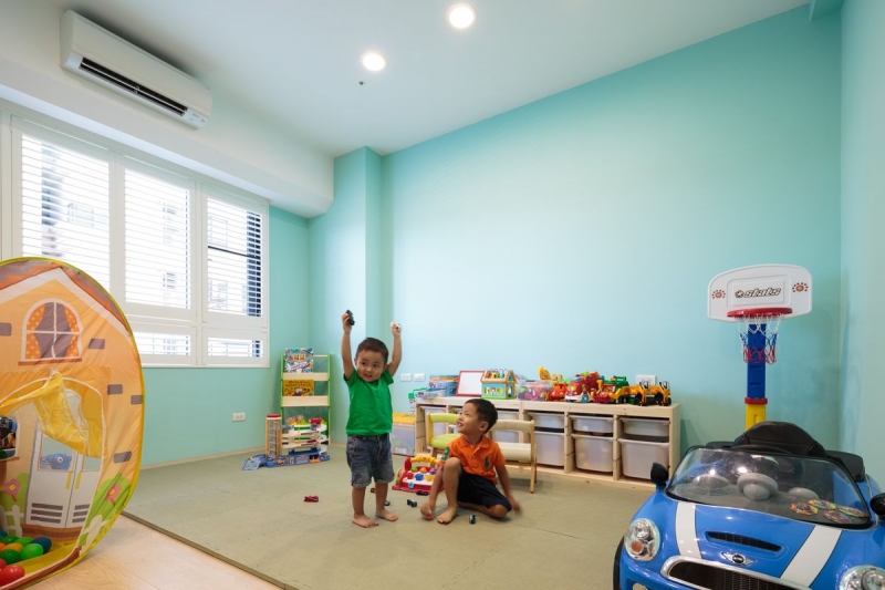 小孩的遊戲房以簡約、不過度裝飾為主要特色,漆上tiffany綠的牆面,創造夢幻色彩。