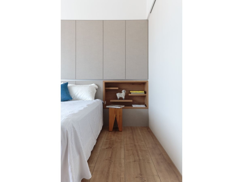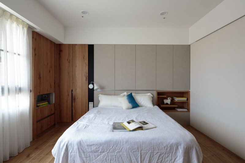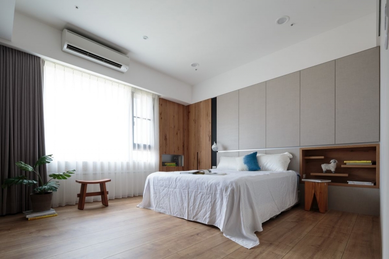 主臥室床頭飾以灰色系的系統櫃,左側則結合木作設計,增添溫潤質感,讓設計靈活不生硬。