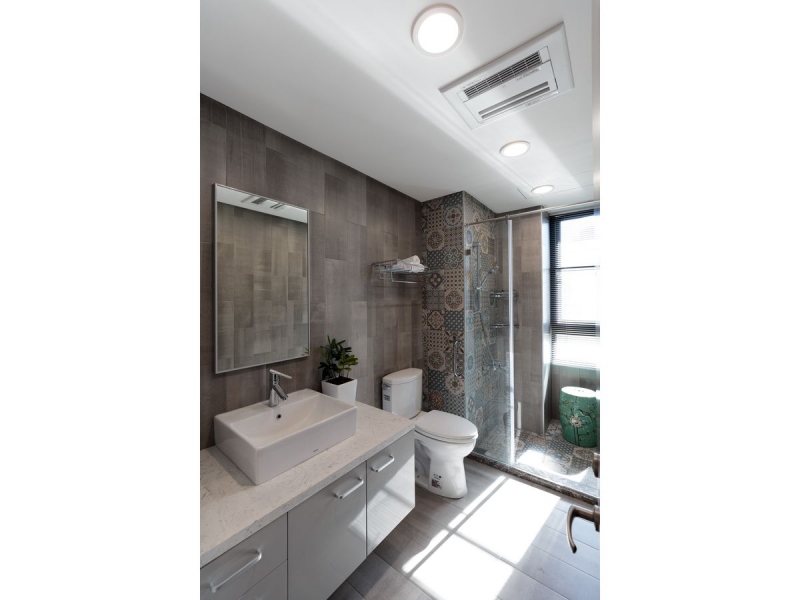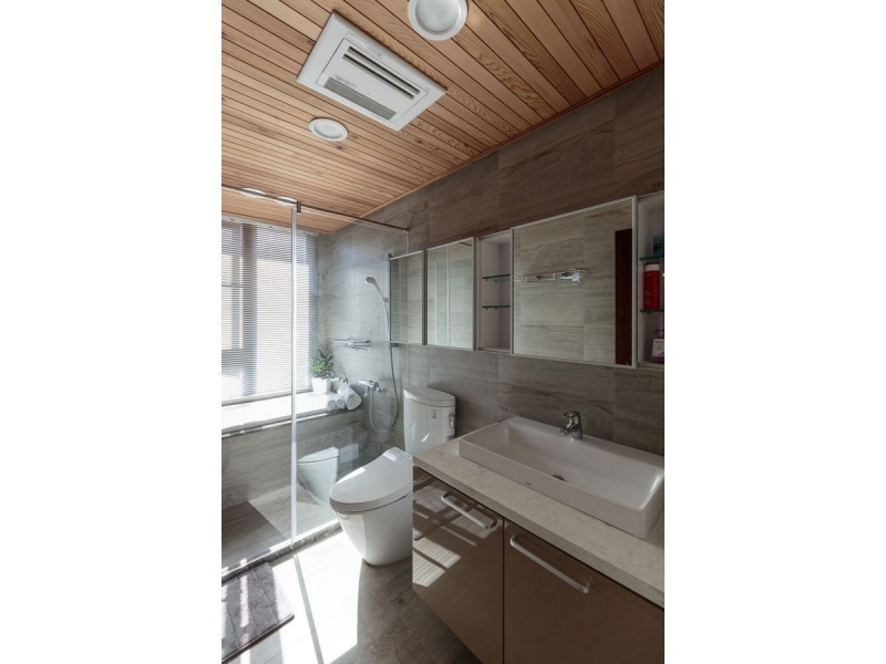 主臥浴室將木質元素的運用延伸到浴室空間裡,木紋天花鋪陳出視覺層次,營造自然的寫意氛圍。