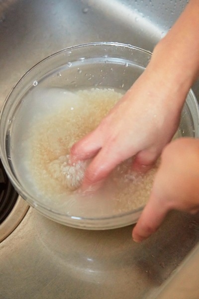 (1)米放入碗中,加水並快速攪拌,再立刻倒掉污水。這是為了避免白米在第一次加水時快速吸收水分附著到米糠臭味,所以一定要趕快倒掉。